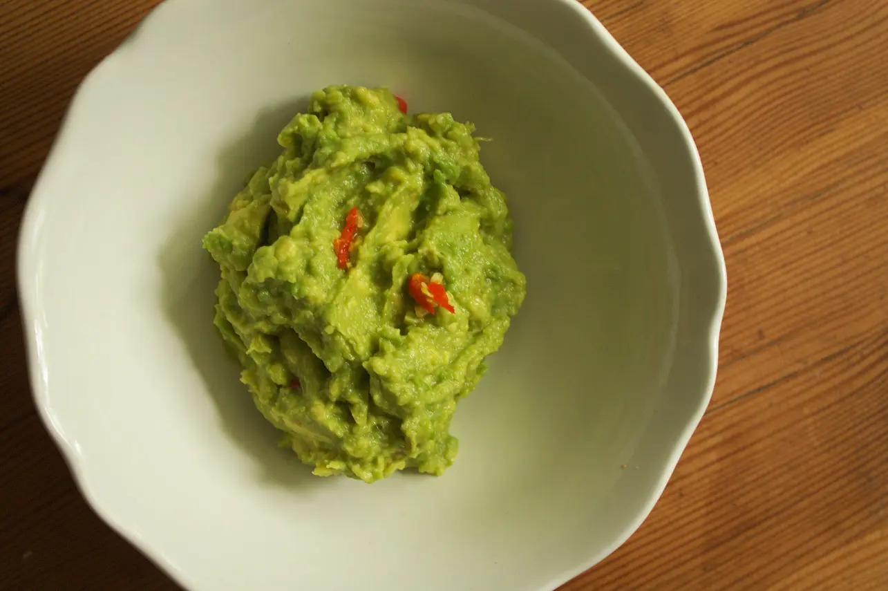 - Die kleine Chili halbieren, entkernen und fein hacken. Zusammen mit dem Zitronensaft zu der Avocado geben und gut vermengen. Alternativ könnt ihr auch Chilipulver, oder Pfeffer verwenden.