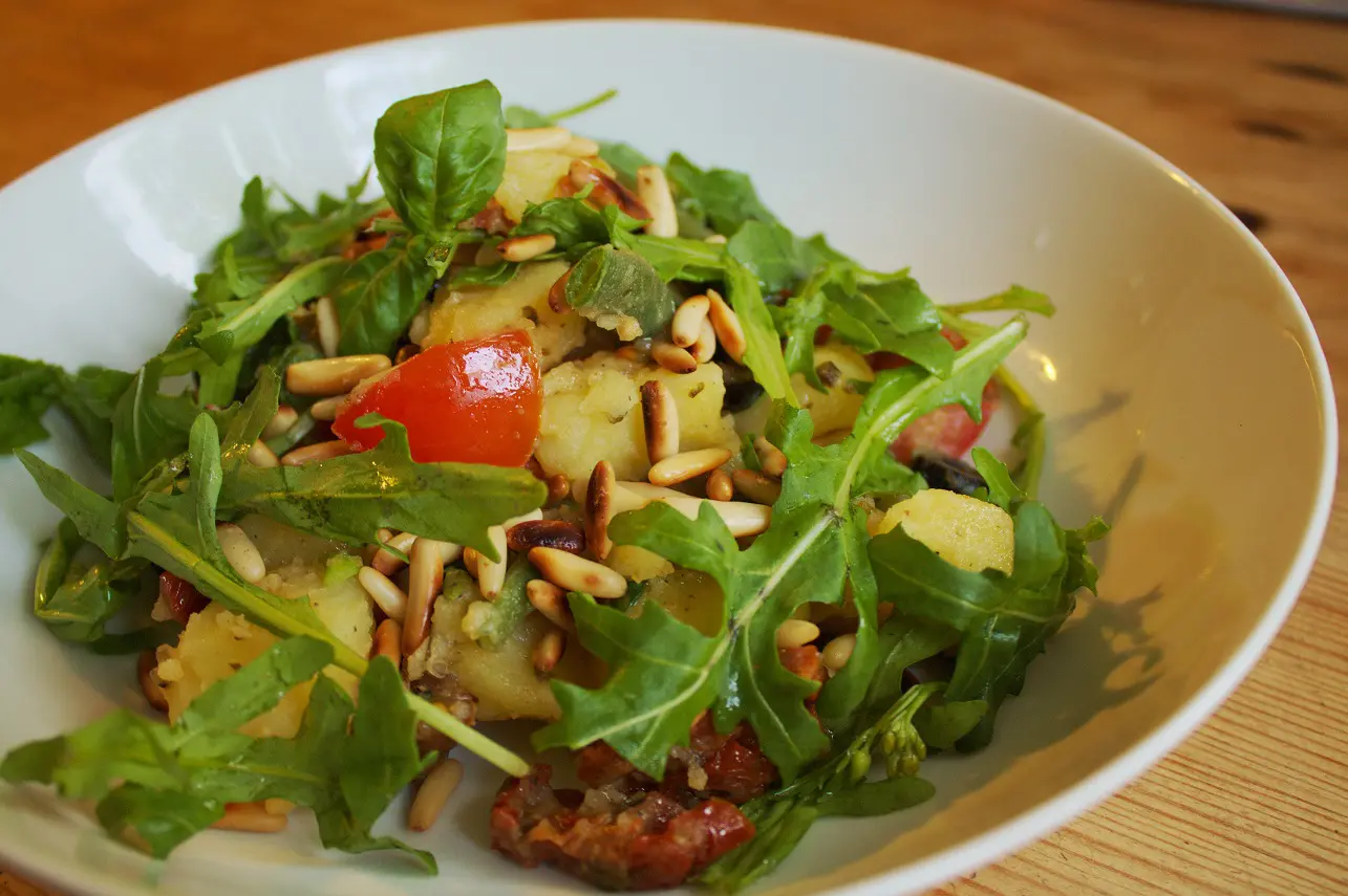 - Den Salat mit der Brühe übergießen, durchmischen und für ungefähr 15 Minuten durchziehen lassen. Rucola waschen und sobald der Salat abgekühlt ist untermengen. Bitte nicht in den warmen Salat geben, da der Rucola sonst direkt zusammenfällt und dann schmeckt es nachher nicht mehr so gut. Den Salat eventuell noch mit Salz und Pfeffer abschmecken.