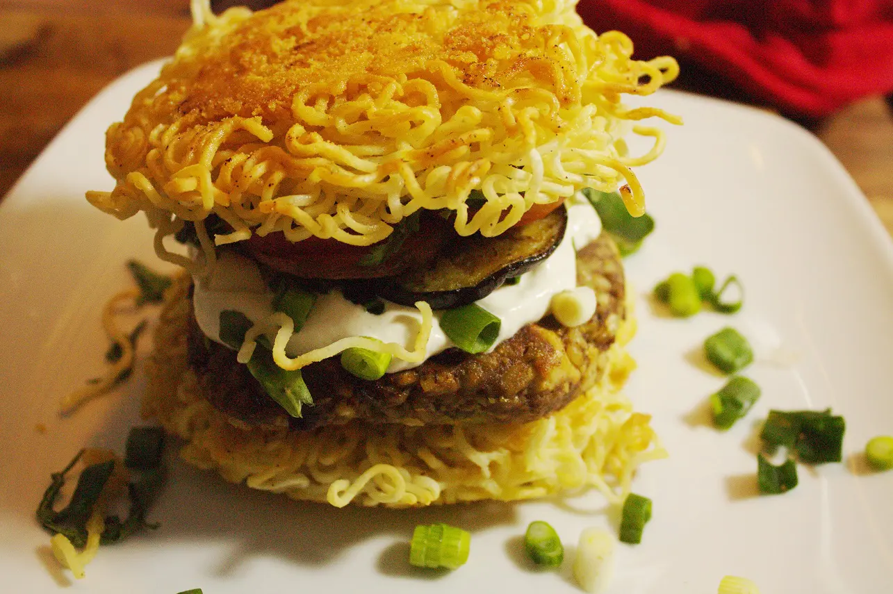 - Danach könnt ihr den Ramen Burger anrichten. Ich habe auch noch ein paar Scheiben Süßkartoffeln und Auberginen auf meinen Burger gegeben. Das könnt ihr aber machen wie ihr möchtet.