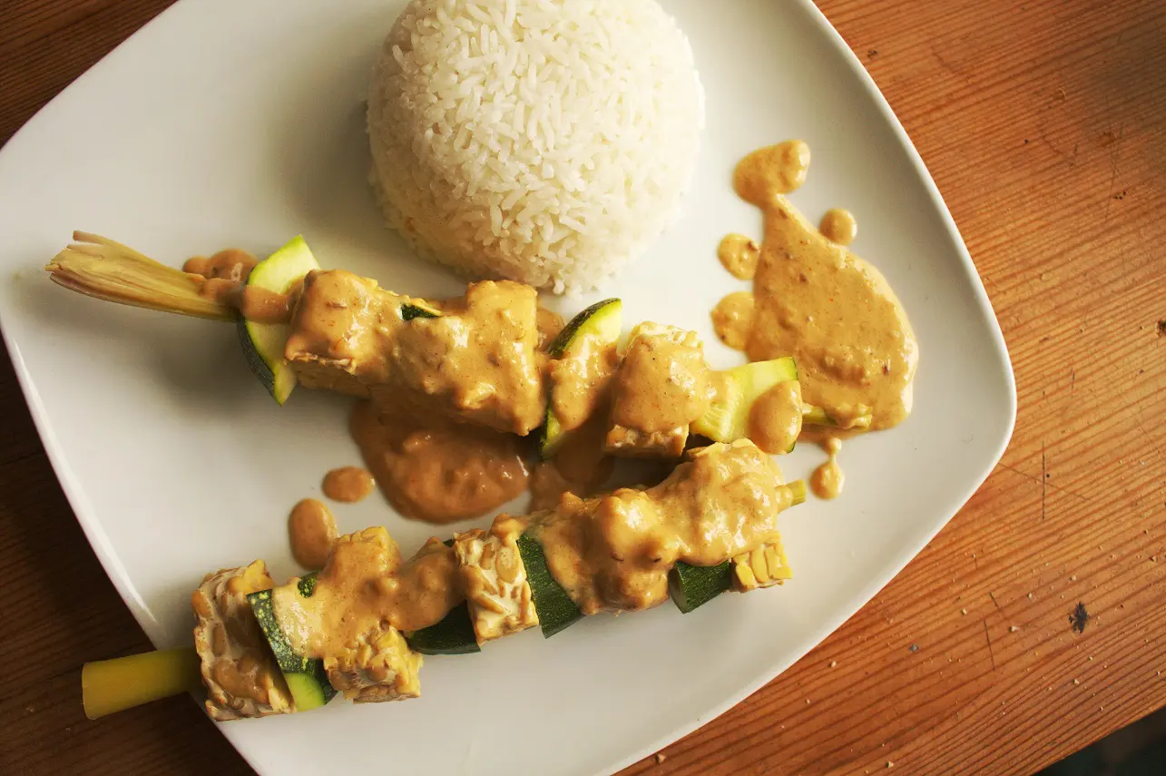 Da ich kein besonders großer Freund von Seitan bin, versuche ich in der Regel eher Tofu, oder Tempeh zu verwenden. Heute hatte ich mal spontan die Idee klassische Saté-Spieße zu machen, da ich noch gefühl 2 kg Tempeh im Kühlschrank hatte. Ist auf jeden Fall ganz gut geworden. Eventuell würde ich nächstes Mal die Spieße vorher noch ein wenig marinieren, damit die Soße nicht so eine dominante Rolle einnimmt. In der Version hier ist es allerdings wirklich schnell gemacht und war auf jeden Fall sehr lecker.