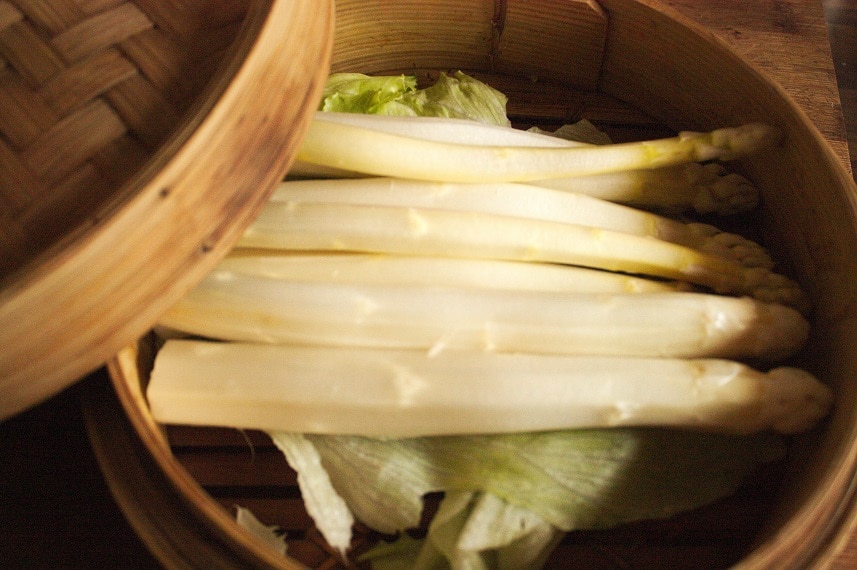 - Den Spargel schälen und in einen Dampfeinsatz legen. Im Asiamarkt gibt es günstige Einsätze aus Bambus. Zum Schutz des Spargels lege ich meistens ein paar Salatblätter drunter, sodass der heiße Dampf nicht direkt auf das Gemüse einwirkt.